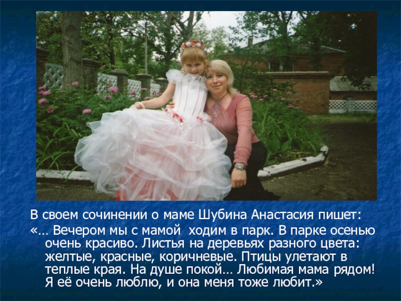 В своем сочинении о маме Шубина Анастасия пишет: «… Вечером мы с мамой ходим в парк. В