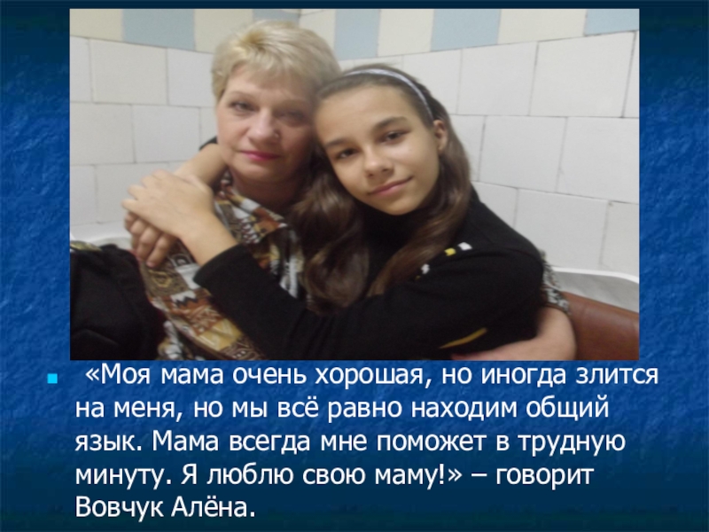 мы всё равно находим общий язык. Мама всегда мне поможет в трудную минуту. Я люблю свою маму!» – говорит Вовчук Алёна.