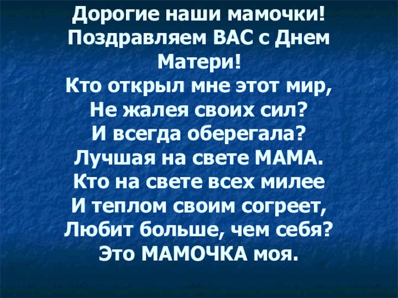 мир, Не жалея своих сил? И всегда оберегала? Лучшая на свете МАМА. Кто на свете всех милее И теплом своим согреет, Любит больше, чем себя? Это МАМОЧКА моя.