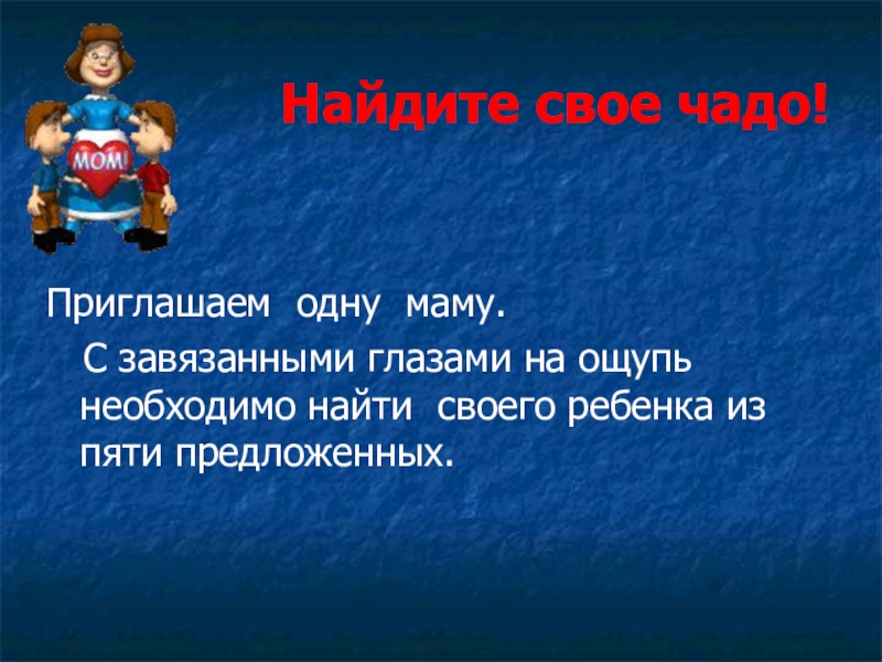 Найдите свое чадо!Приглашаем одну маму.  С завязанными глазами на ощупь необходимо найти своего ребенка из пяти