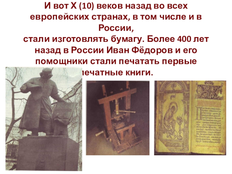 числе и в России, стали изготовлять бумагу. Более 400 лет назад в России Иван Фёдоров и его помощники стали печатать первые печатные книги.
