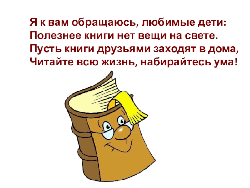 Я к вам обращаюсь, любимые дети:  Полезнее книги нет вещи на свете.  Пусть книги друзьями