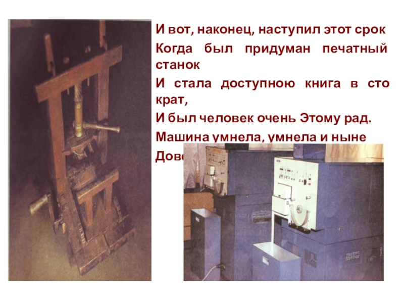 И вот, наконец, наступил этот срокКогда был придуман печатный станокИ стала доступною книга в сто крат,И был