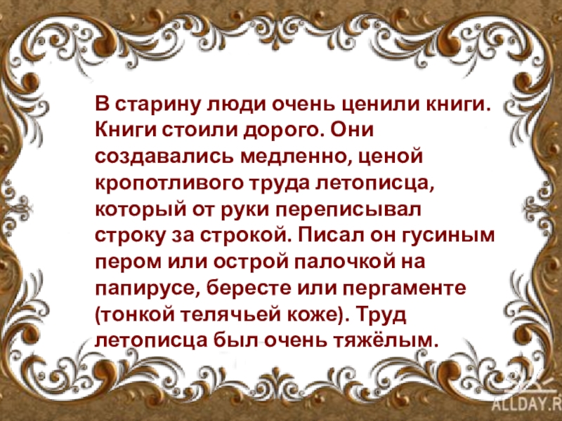 В старину люди очень ценили книги.Книги стоили дорого. Они создавались медленно, ценой кропотливого труда летописца, который от
