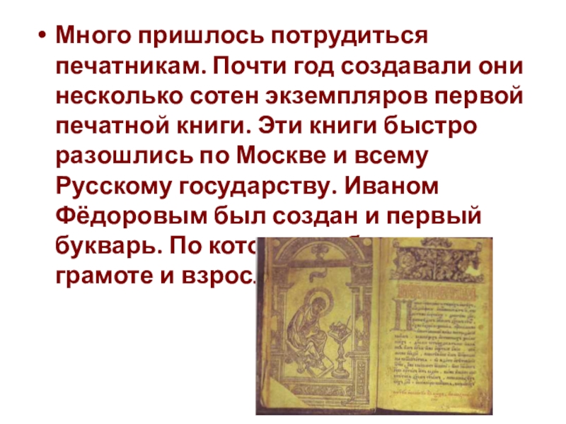 первой печатной книги. Эти книги быстро разошлись по Москве и всему Русскому государству. Иваном Фёдоровым был создан и первый букварь. По которому обучались грамоте и взрослые и дети.