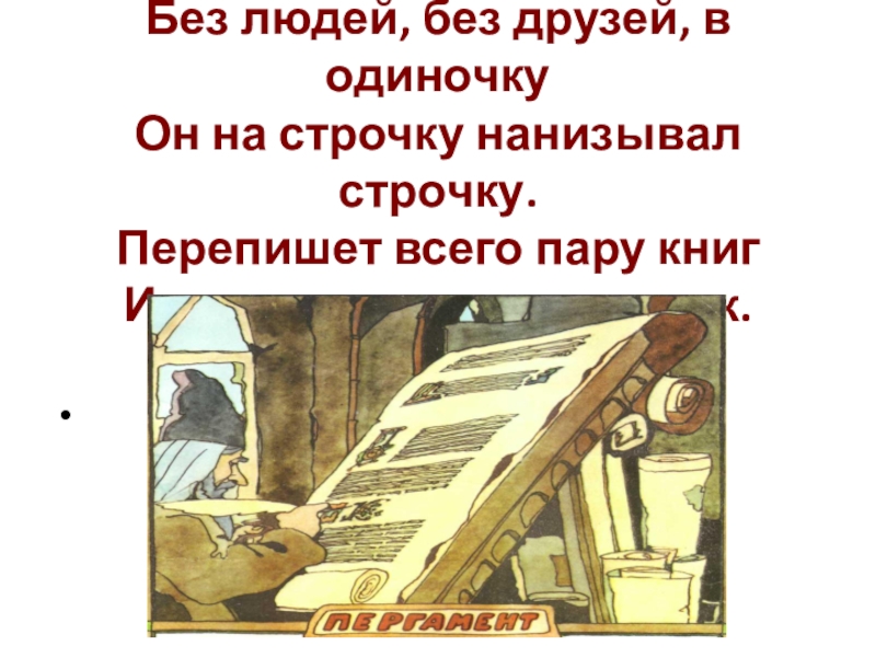 Слайд 8Без людей, без друзей, в одиночку Он на строчку нанизывал строчку. Перепишет всего