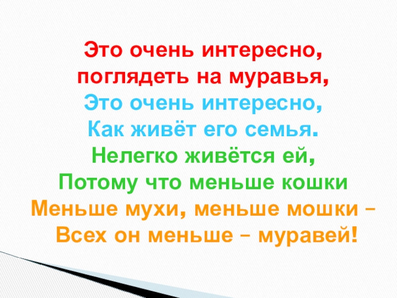 Слайд 5Это очень интересно, поглядеть на муравья, Это очень интересно, Как живёт его семья. Нелегко