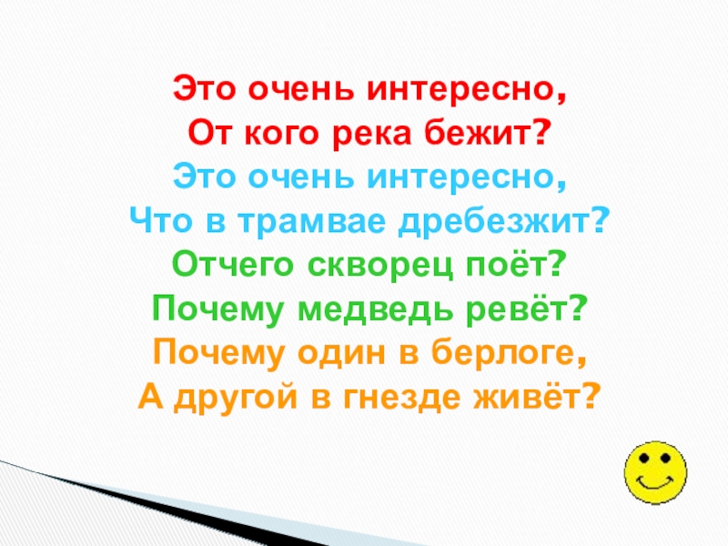 Слайд 3Это очень интересно, От кого река бежит? Это очень интересно, Что в трамвае дребезжит? Отчего