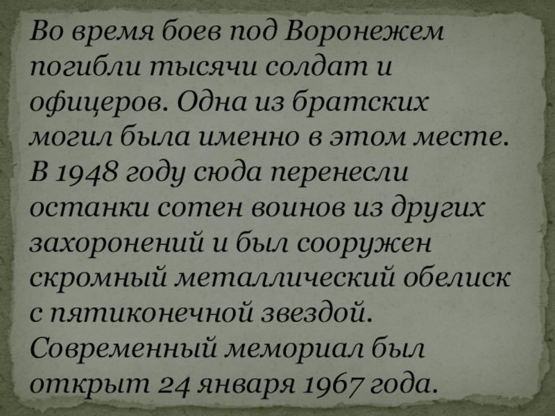 Слайд 6 Во время боев под Воронежем погибли тысячи солдат и офицеров. Одна
