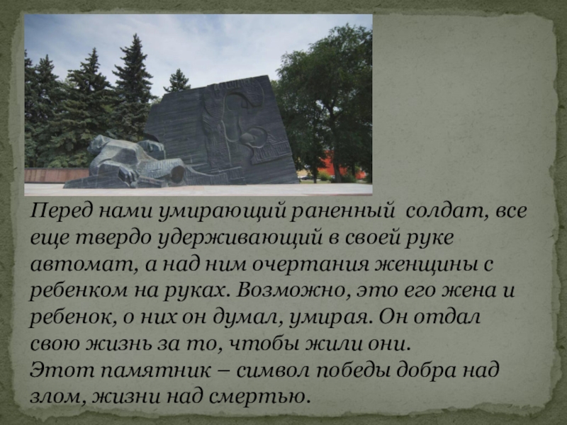 руке автомат, а над ним очертания женщины с ребенком на руках. Возможно, это его жена и ребенок, о них он думал, умирая. Он отдал свою жизнь за то, чтобы жили они. Этот памятник – символ победы добра над злом, жизни над смертью.