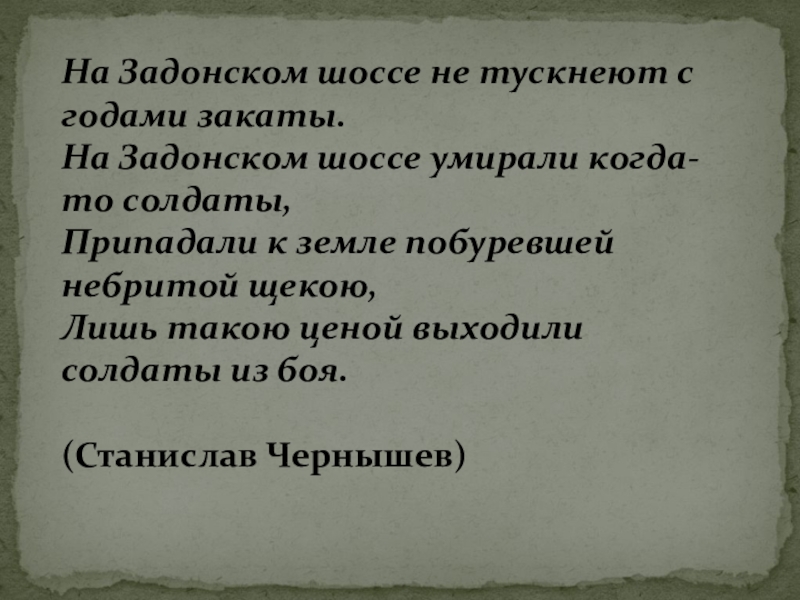 На Задонском шоссе не тускнеют с годами закаты. На Задонском шоссе умирали когда-то солдаты, Припадали к земле побуревшей небритой щекою, Лишь такою ценой выходили солдаты из боя.