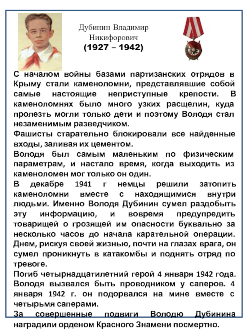 За совершенные подвиги Володю Дубинина наградили орденом Красного Знамени посмертно.