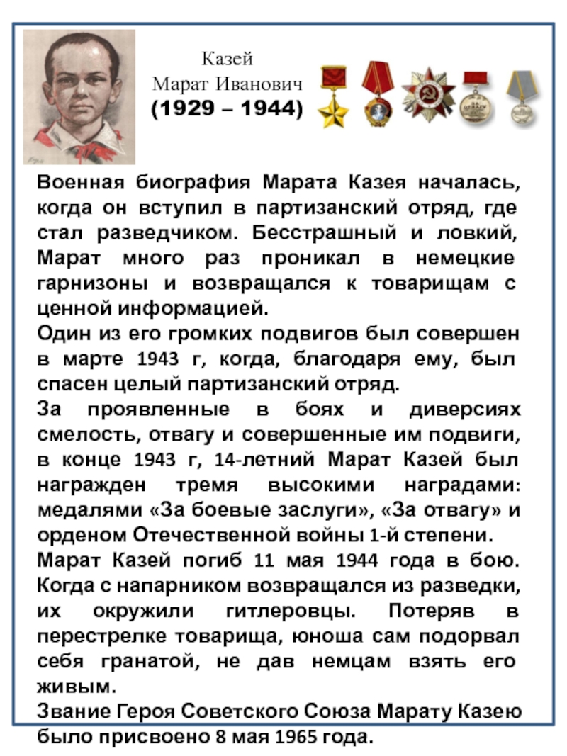 в партизанский отряд, где стал разведчиком. Бесстрашный и ловкий, Марат много раз проникал в немецкие гарнизоны и возвращался к товарищам с ценной информацией.