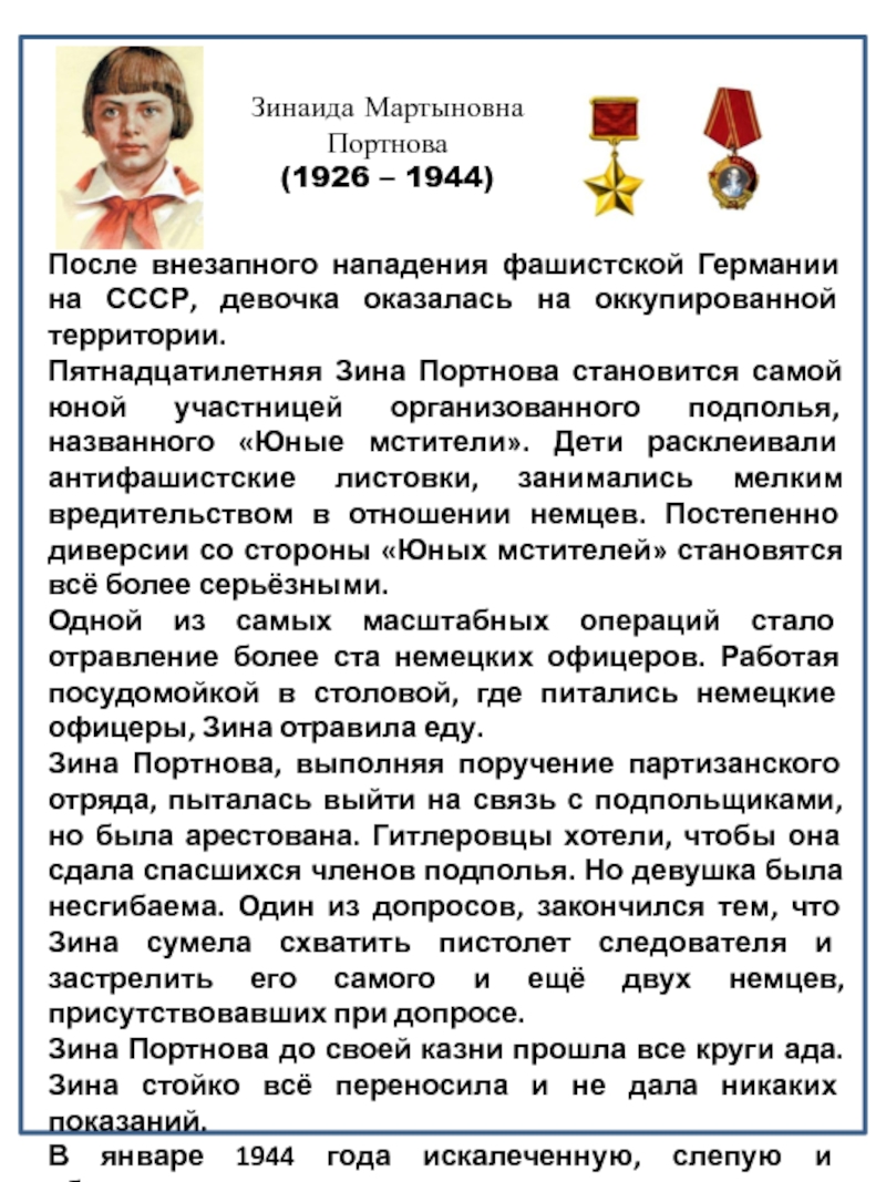 Зина Портнова до своей казни прошла все круги ада. Зина стойко всё переносила и не дала никаких показаний.