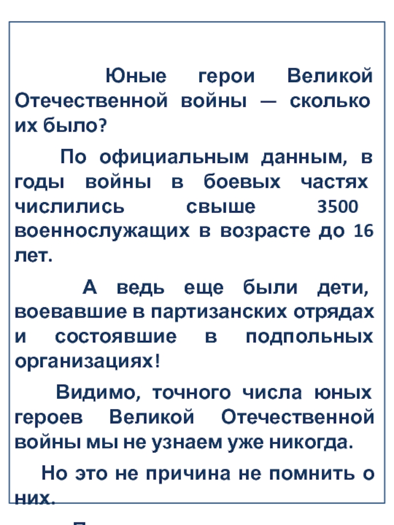Видимо, точного числа юных героев Великой Отечественной войны мы не узнаем уже никогда.