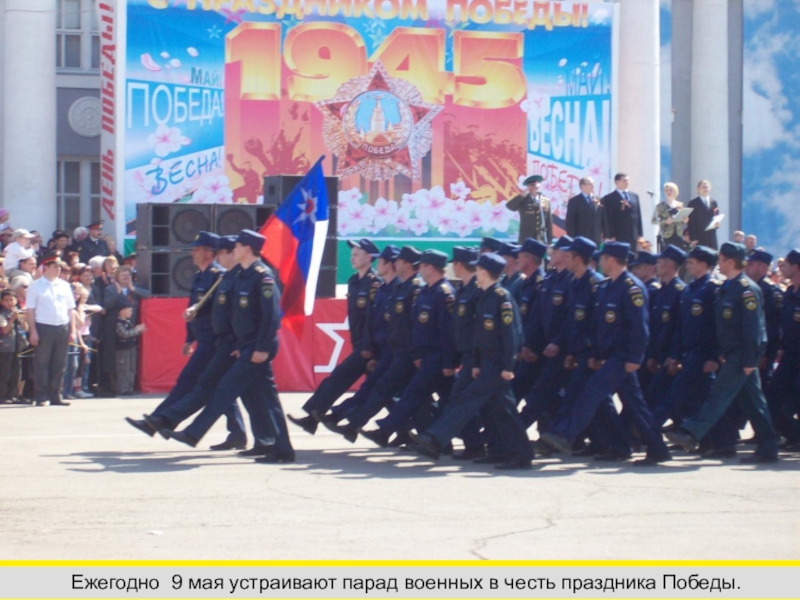 Слайд 12Ежегодно 9 мая устраивают парад военных в честь праздника Победы.