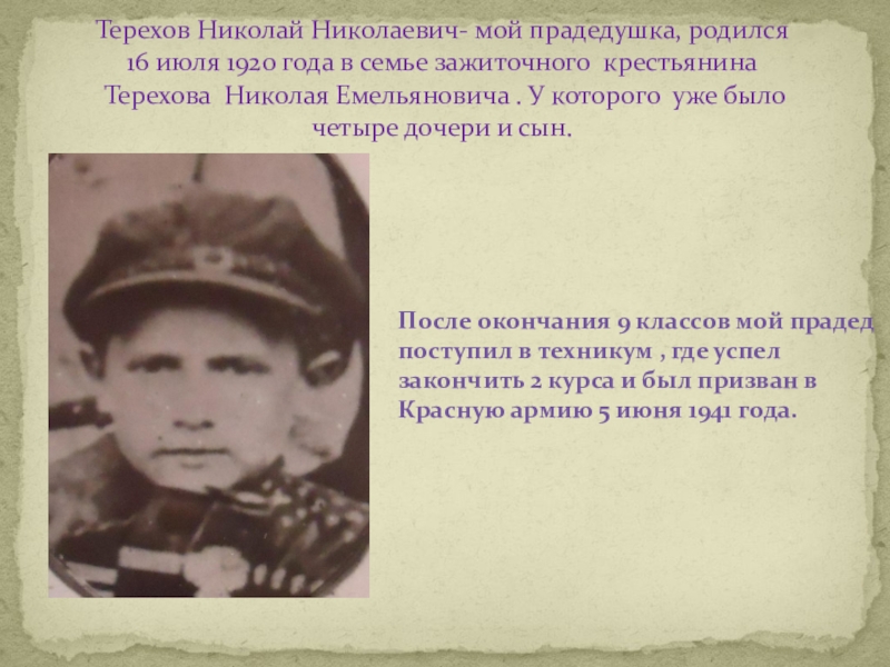 После окончания 9 классов мой прадед поступил в техникум , где успел закончить 2 курса и был призван в Красную армию 5 июня 1941 года.