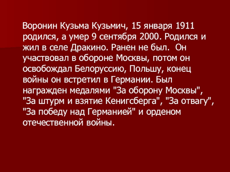 Воронин Кузьма Кузьмич, 15 января 1911 родился, а умер 9 сентября 2000. Родился и жил
