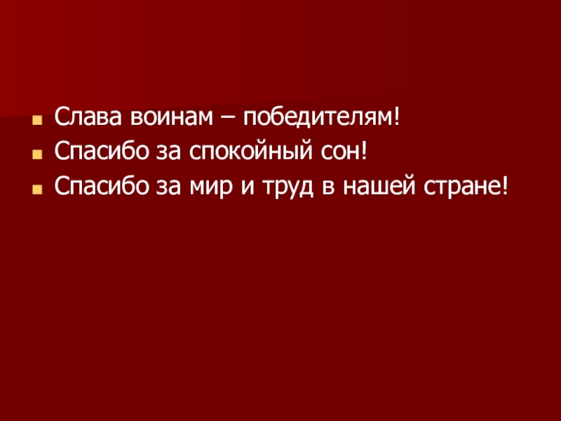 Слава воинам – победителям! Спасибо за спокойный сон!Спасибо за мир и труд в нашей стране!