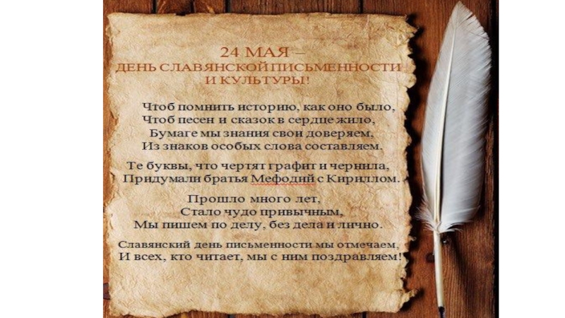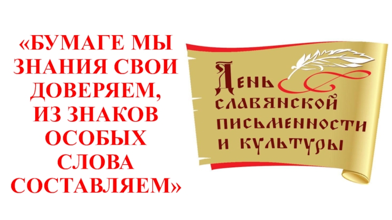 Презентация, доклад ко Дню славянской письменности и культуры Бумаге мы знания свои доверяем, из знаков особых слова составляем!