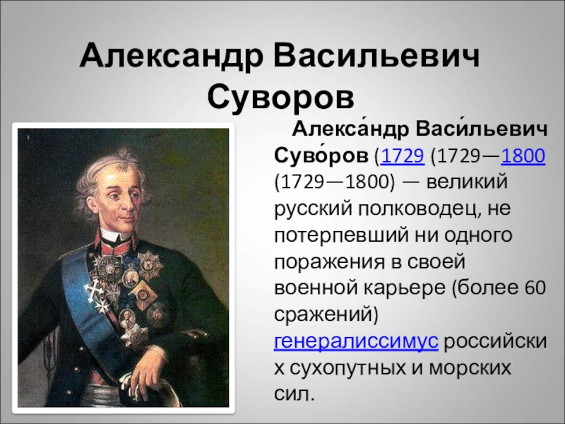 Александр Васильевич Суворов    Алекса́ндр Васи́льевич Суво́ров (1729 (1729—1800 (1729—1800) — великий русский полководец, не потерпевший ни одного поражения