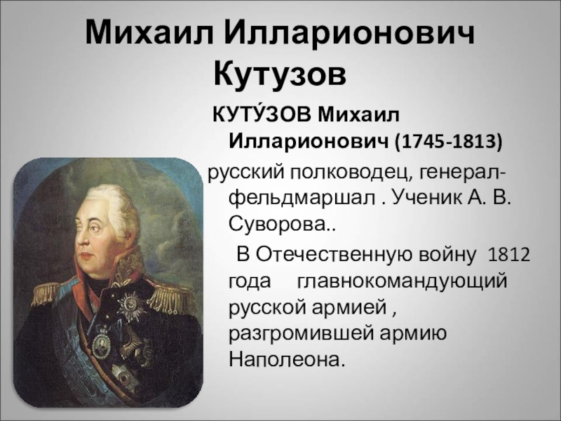 Михаил Илларионович Кутузов КУТУ́ЗОВ Михаил Илларионович (1745-1813) русский полководец, генерал-фельдмаршал . Ученик А. В. Суворова..