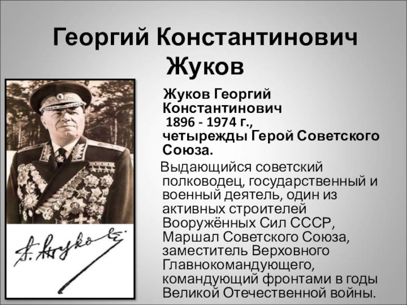 Георгий Константинович Жуков   Жуков Георгий Константинович  1896 - 1974 г., четырежды Герой Советского Союза.