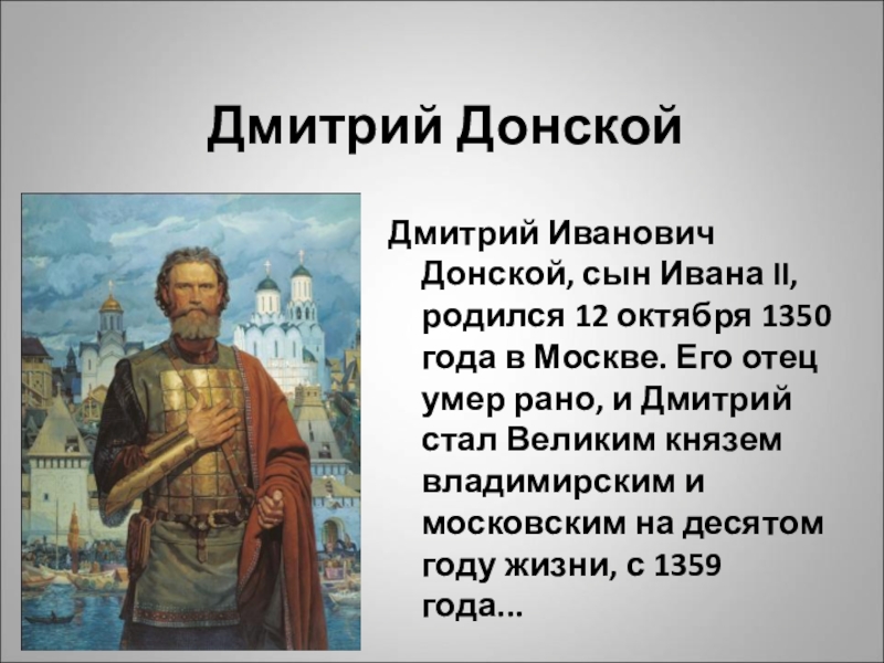 года в Москве. Его отец умер рано, и Дмитрий стал Великим князем владимирским и московским на десятом году жизни, с 1359 года...
