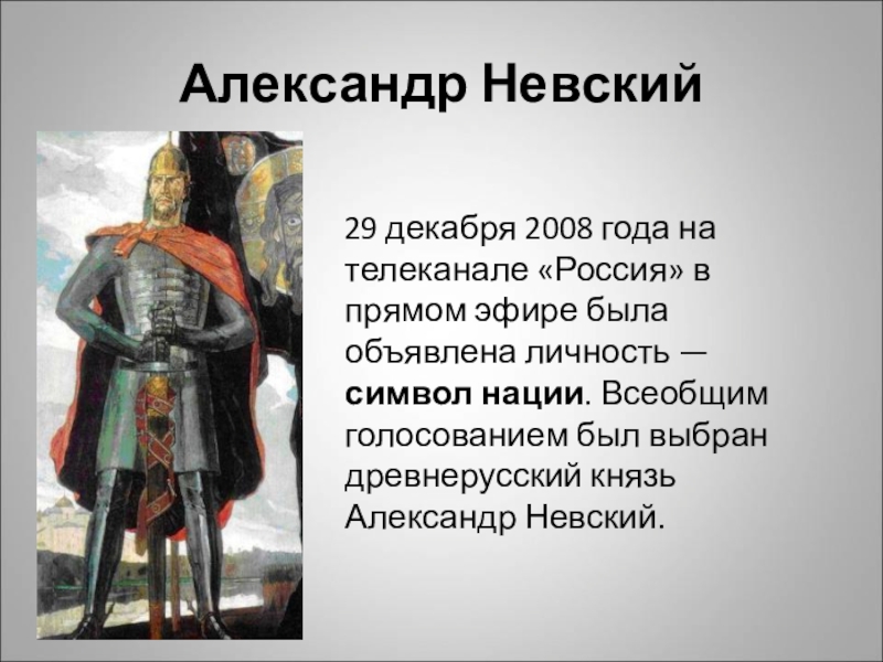 Александр Невский 29 декабря 2008 года на телеканале «Россия» в прямом эфире была объявлена личность — символ нации. Всеобщим голосованием был выбран древнерусский князь Александр Невский.