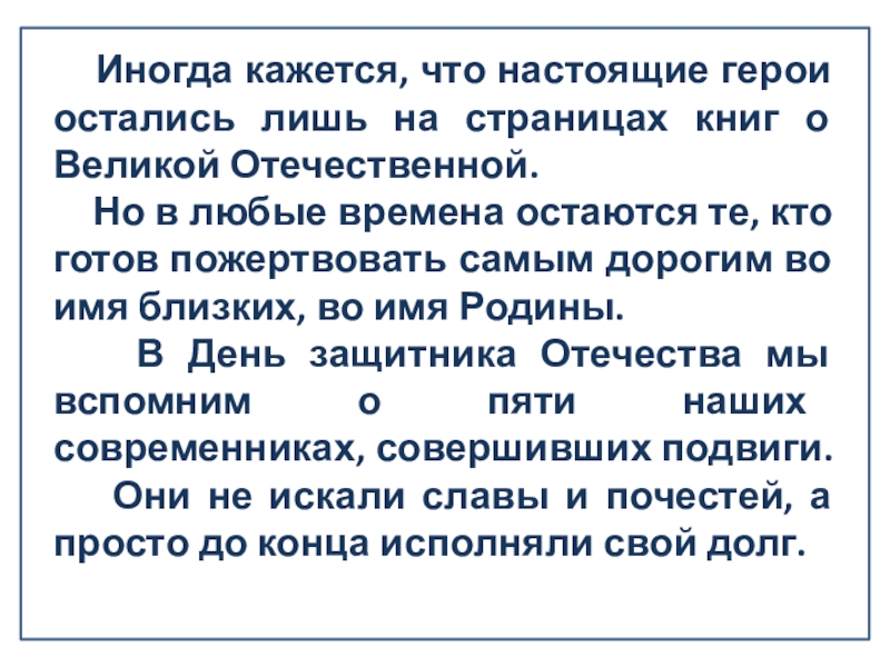 Слайд 2 Иногда кажется, что настоящие герои остались лишь на страницах