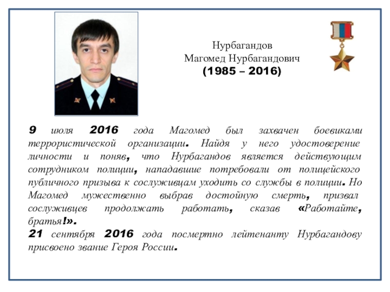 21 сентября 2016 года посмертно лейтенанту Нурбагандову присвоено звание Героя России.