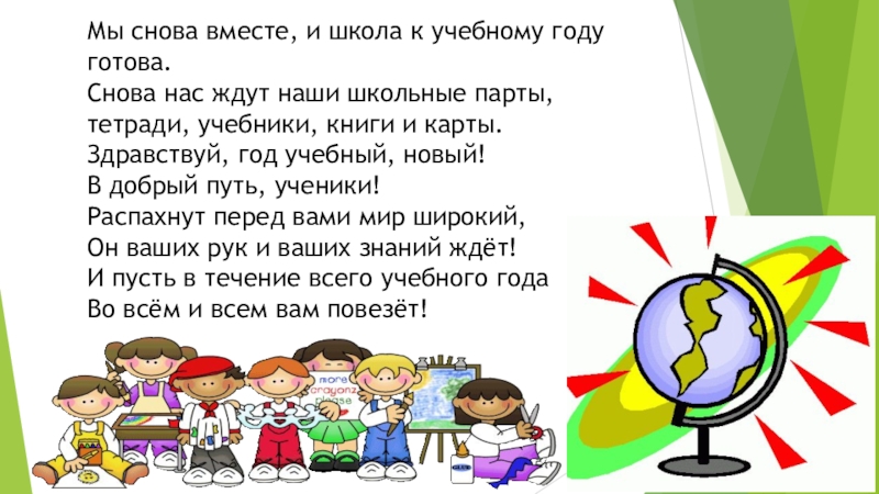 Мы снова вместе, и школа к учебному году готова.Снова нас ждут наши школьные парты, тетради, учебники, книги