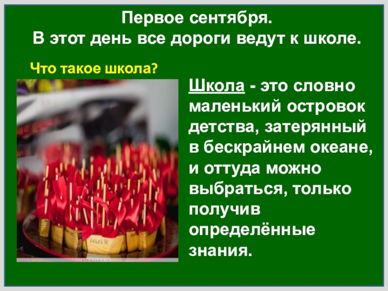 Школа - это словно маленький островок детства, затерянный в бескрайнем океане, и оттуда можно выбраться, только получив определённые знания.