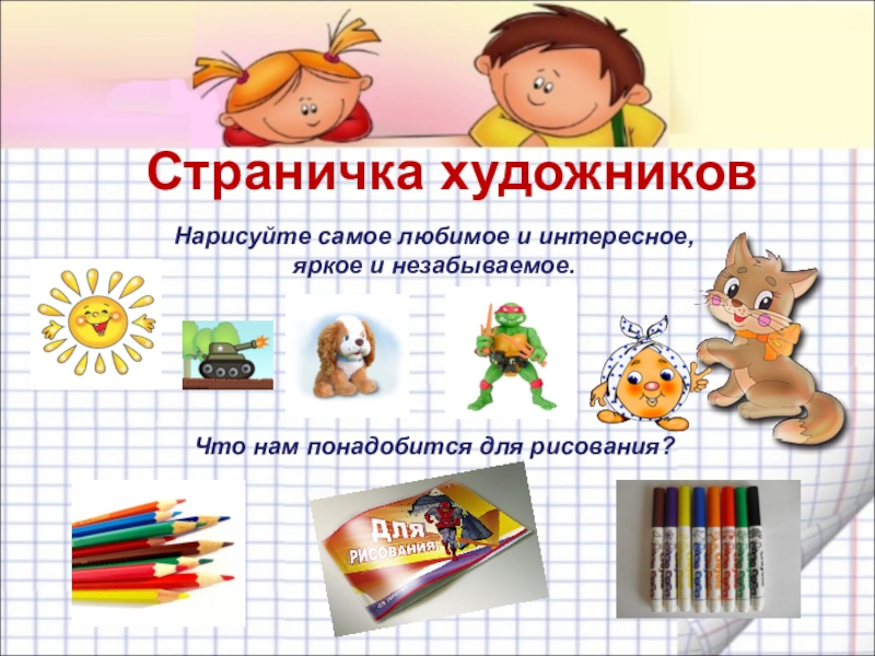 этой школе, вспомните меня, своих товарищей по классу. А чтобы было легче вспоминать, сделаем рисунки. Что рисовать, каждый выберет сам.