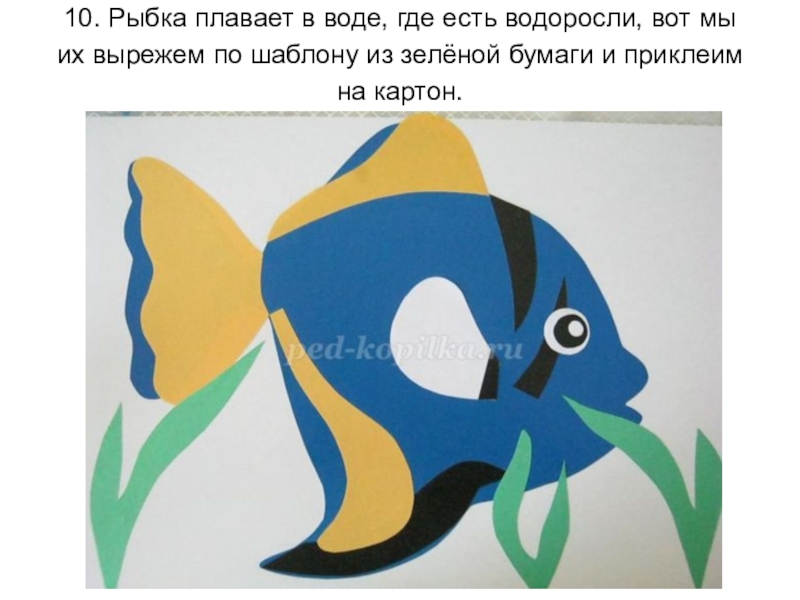 10. Рыбка плавает в воде, где есть водоросли, вот мы их вырежем по шаблону из зелёной бумаги