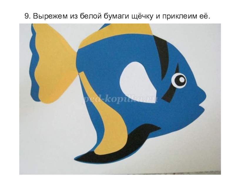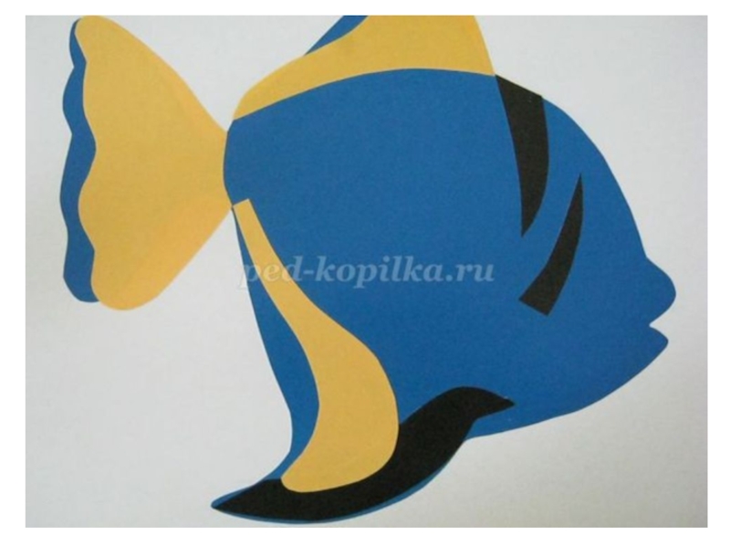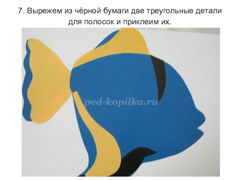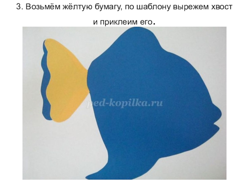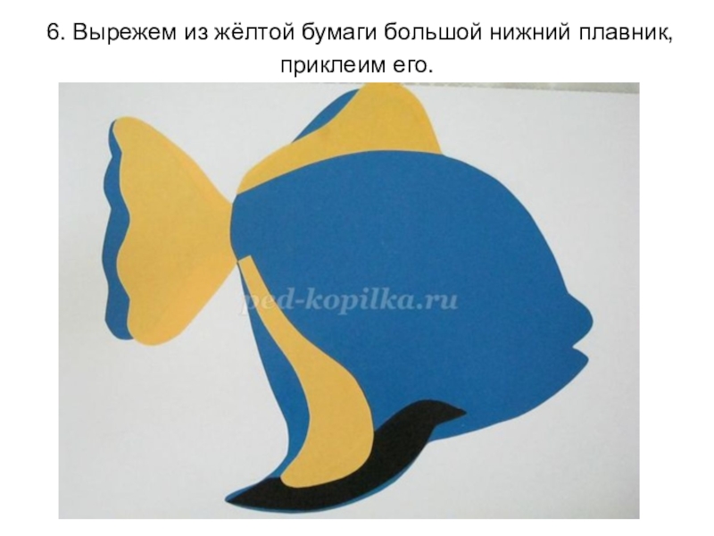 Слайд 96. Вырежем из жёлтой бумаги большой нижний плавник, приклеим его.