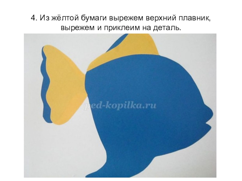 Слайд 74. Из жёлтой бумаги вырежем верхний плавник, вырежем и приклеим на