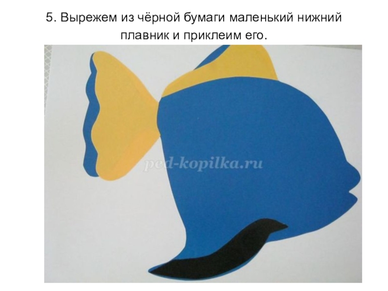 Слайд 85. Вырежем из чёрной бумаги маленький нижний плавник и приклеим его.