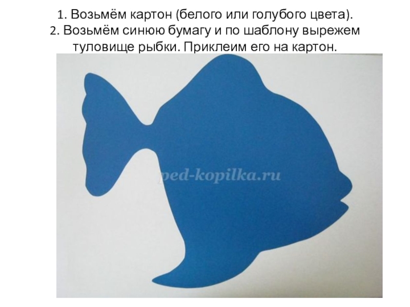 1. Возьмём картон (белого или голубого цвета). 2. Возьмём синюю бумагу и по шаблону вырежем туловище рыбки.