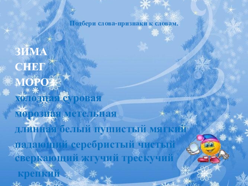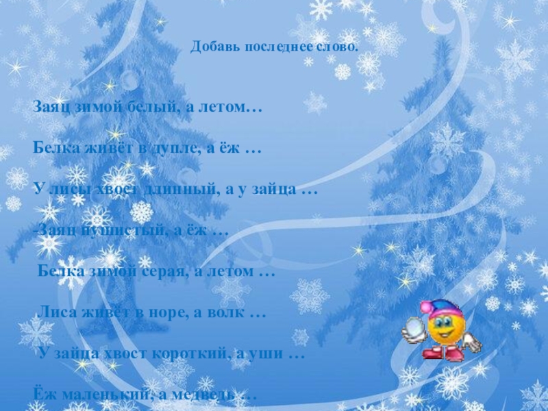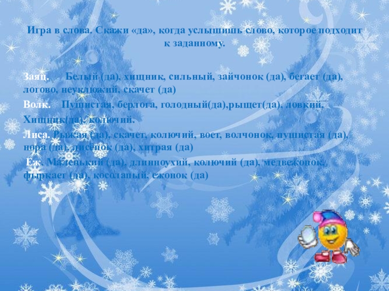 Заяц. Белый (да), хищник, сильный, зайчонок (да), бегает (да), логово, неуклюжий, скачет (да)