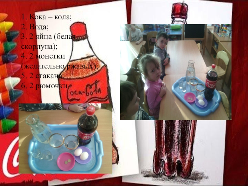 1. Кока – кола;2. Вода;3. 2 яйца (белая скорлупа);4. 2 монетки(желательно ржавых);5. 2 стакана;6. 2 рюмочки