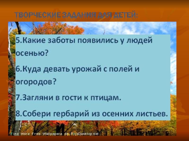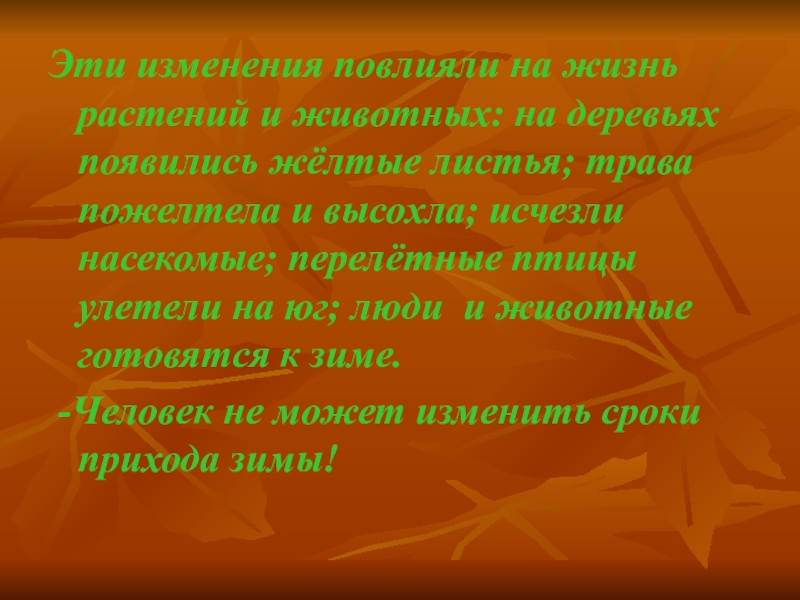 жёлтые листья; трава пожелтела и высохла; исчезли насекомые; перелётные птицы улетели на юг; люди и животные готовятся к зиме.