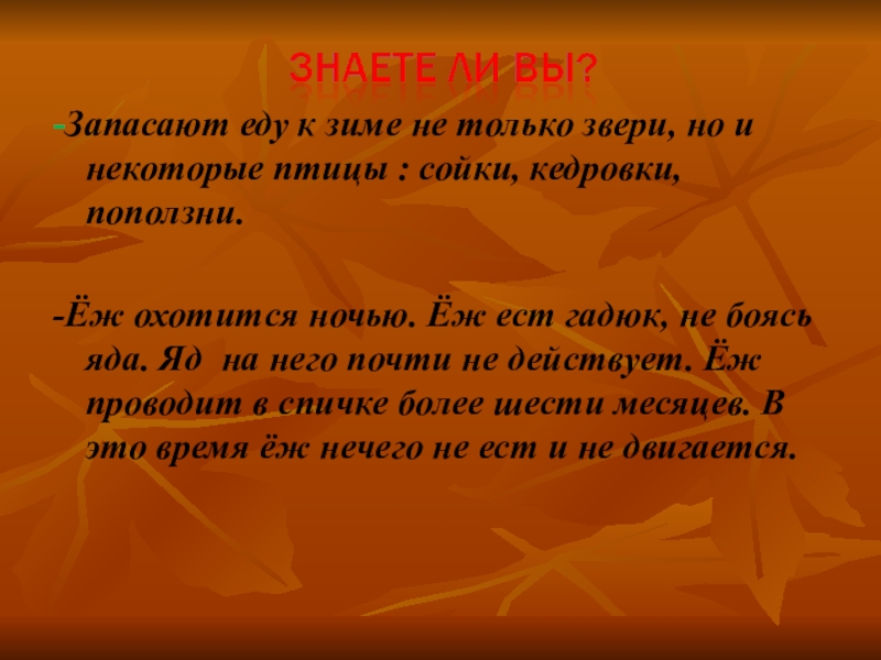 -Ёж охотится ночью. Ёж ест гадюк, не боясь яда. Яд на него почти не действует. Ёж проводит в спичке более шести месяцев. В это время ёж нечего не ест и не двигается.