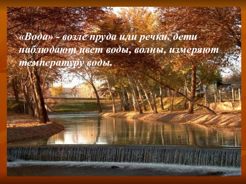 «Вода» - возле пруда или речки. дети наблюдают цвет воды, волны,
