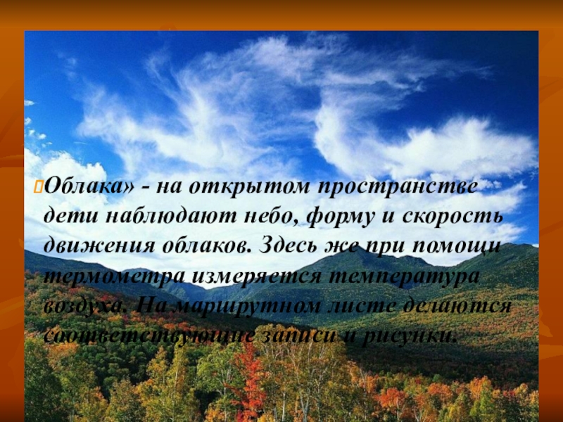движения облаков. Здесь же при помощи термометра измеряется температура воздуха. На маршрутном листе делаются соответствующие записи и рисунки.