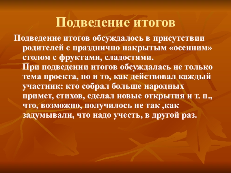 столом с фруктами, сладостями. При подведении итогов обсуждалась не только тема проекта, но и то, как действовал каждый участник: кто собрал больше народных примет, стихов, сделал новые открытия и т. п., что, возможно, получилось не так ,как задумывали, что надо учесть, в другой раз.