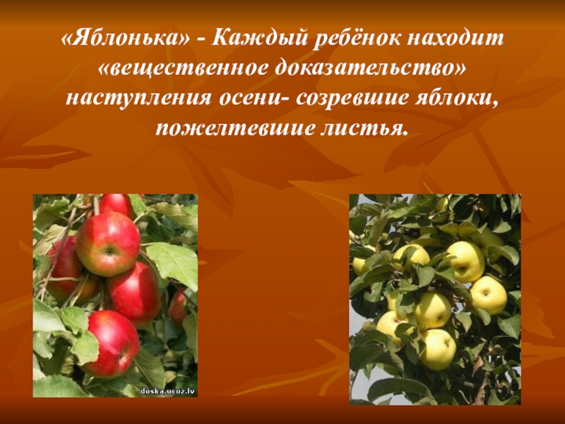 Слайд 18«Яблонька» - Каждый ребёнок находит «вещественное доказательство» наступления осени- созревшие яблоки,
