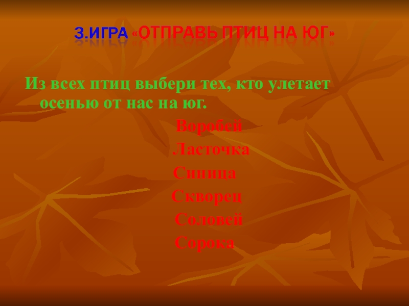 Слайд 28Из всех птиц выбери тех, кто улетает осенью от нас на