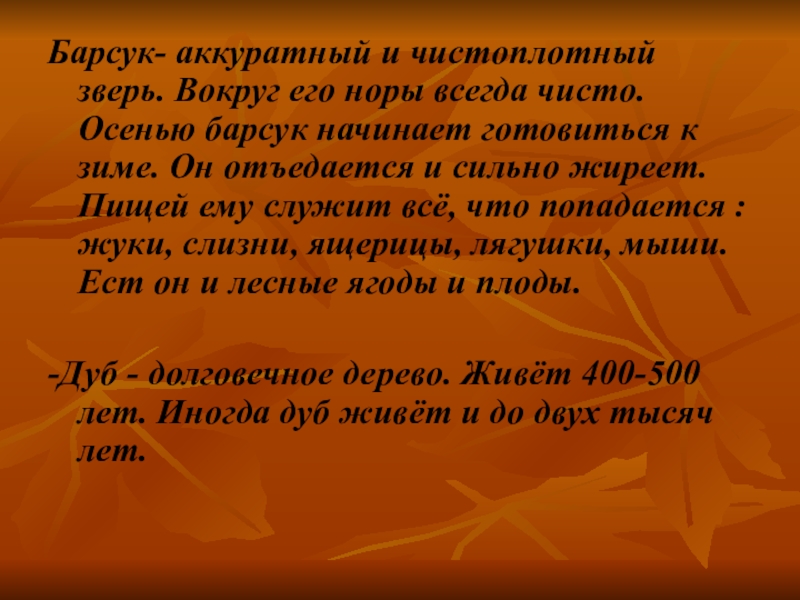 Барсук- аккуратный и чистоплотный зверь. Вокруг его норы всегда чисто. Осенью