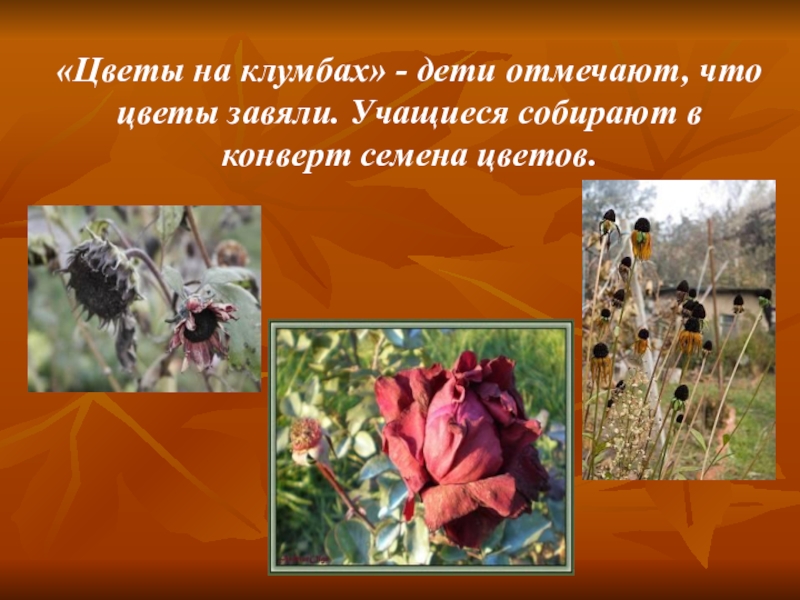 Слайд 19«Цветы на клумбах» - дети отмечают, что цветы завяли. Учащиеся собирают